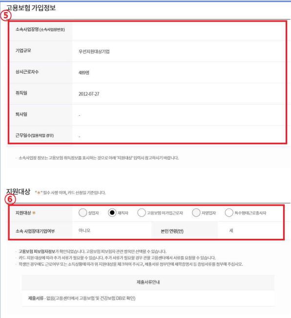 5. 근로자일 경우: 소속사업자명, 시업, 규모, 상시근로자수, 취득일, 퇴사일, 근무일수 등 호가인