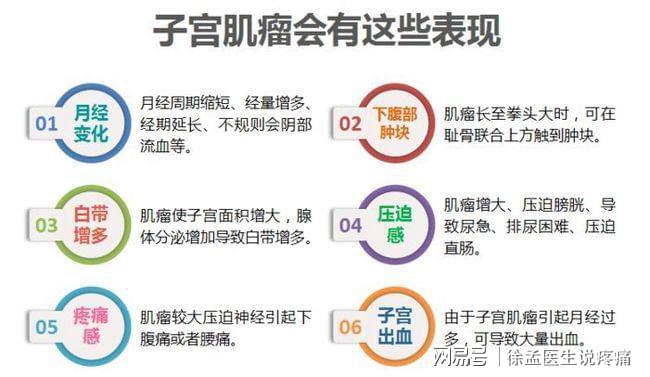 1. 자궁근종: 자궁에서 골반강 또는 복강으로 돌출되어 공간이 넓기 때문에 상대적으로 커질 수 있으며, 일반적으로 임상 증상이 덜 뚜렷하며, 복부에 덩어리가 생기거나 복통이 지속되는 등 증상이 나타나기 전에 상당한 크기로 자랄 수 있습니다.