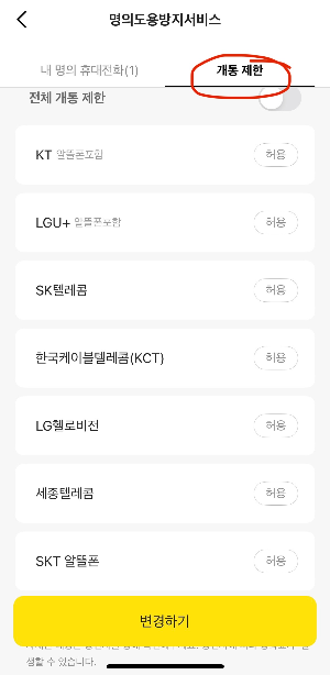 카카오뱅크에 들어가서 점세개 누르기 → 인증.보안선택 → 스크롤내려서 명의도용방지서비스 선택 → 조회 하기 클릭 → 모두 동의하고 인증하기 → 주민등록번호 입력 → 윗상단에 내명의 휴대전화 확인, 옆에 개통제한 클릭 → 전체개통제한 노란색 나오게 옆으로 밀기 → 그럼 아래 알뜰폰 및 대리점 차단으로 뜸.